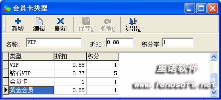同折扣。打開“會員管理”菜單中的“會員卡設置”窗口,如圖所示,可自行增加會員卡的類型。