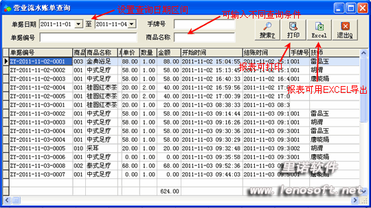 可以查詢出某段時間內所有技師的服務情況。此表格包括的項目非常明細,可以統計出單據號、房號、手牌號、技師工號、服務項目、數量、金額、提成、與此服務項目相關內容都可以非常明細的統計出來。 |